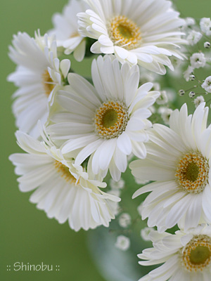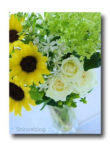 先生のアドバイスで入れたグリーンの薔薇、そして白いピンポンマム。