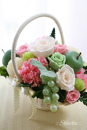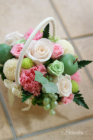 グリーン系のフルーツ、白い薔薇、そしてグリーンのリーフ類。